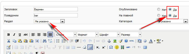 Часто поступают вопросы такого содержания мол " я хочу разместить ряд статей в виде блога на главной странице как это сделать " на самом деле сделать это очень просто, для начала вносим корректировки в материалы которые должны отображаться на главной а именно указываем раздел к которому относится статья в нашем случаи ставим Не указано + ставим галочку опубликовано на главной ставим да, и так проделываем совсем статьями которые у нас должны отображаться на главной.