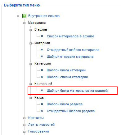 теперь нам надо изменить тип нашего пункта Главная для этого выбираем с права Сменить тип и выбираем из списка Шаблон блога материалов на главной,