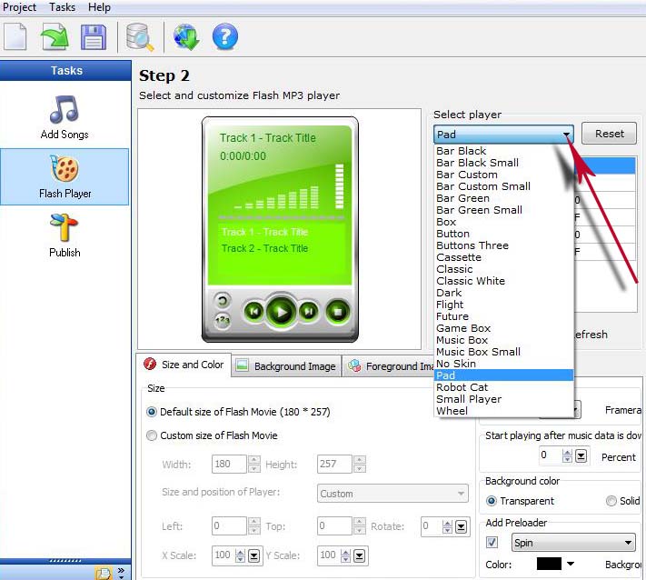 2.шаг выбираем из списка как будет выглядеть сам флеш плеер его расцветку размер и тд....