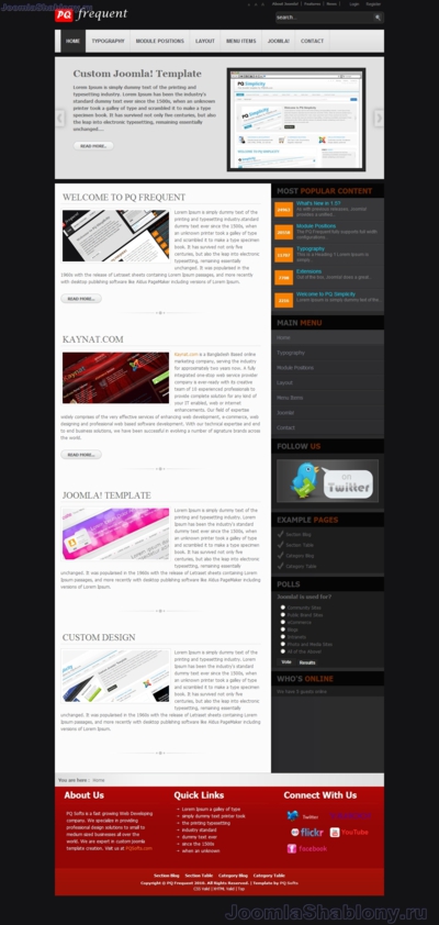 Frequent - шаблон бесплатного характера, который можно применять для интернет-ресурсов разнообразного тематического характера под управлением cms Joomla! Шаблон предоставляет в распоряжение правую колонку и 12 модульных позиций.