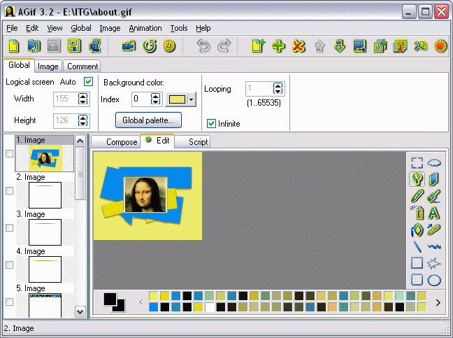 Возможности программы Active GIF Creator состоят в следующем: она создает анимированные GIF-файлы из любых графических файлов и метафайлов Windows, а также может импортировать образы и из других GIF-файлов. Active GIF Creator редактирует начальные образы, используя возможности внутреннего графического редактора.Что он делает с образами, он их дублирует, объединяет, при необходимости вырезает, меняет размеры, разворачивает и перемещает образы. Active GIF Creator может добавлять и удалять текстовые комментарии, а также может добавлять скрытую подпись для защиты, позволяет применять собственный набор эффектов для самого образа или для его некоторой выделенной прямоугольной части, с ним можно просмотреть GIF-файл на Web-странице используя различные фоны.