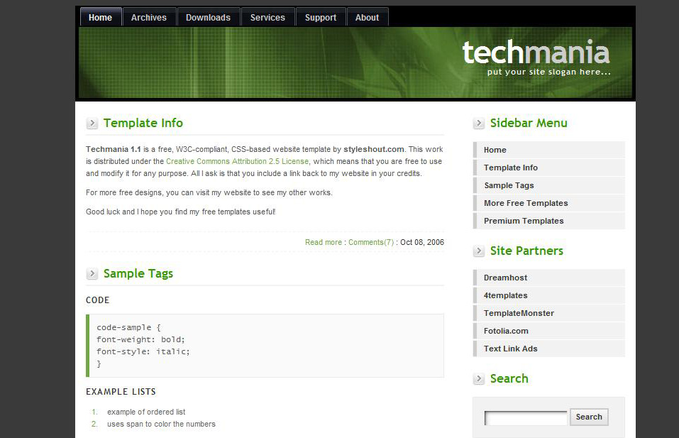 Не плахой шаблон в строгом стиле в темно зеленых танах такой шаблон хорошо подойдет для информационной тематике сайта инструкции, рекомендации и тд..