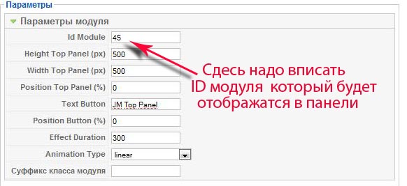 Теперь по технической части: после установки модуля заходим в менеджер модулей и выбираем наш модуль, задаем позицию модулю как можно выше к верху + в настройках нужно указать ID модуля который вы хотели б вывести в нашей выпадающий панели